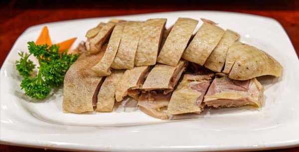 5、撈出鹵制好的咸水鴨,切塊裝盤。