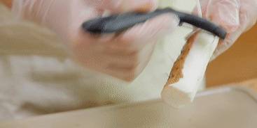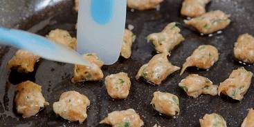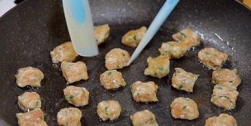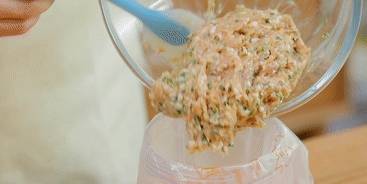 肉餡裝入裱花袋當中,煎出一個小口。傢裡沒有裱花袋的,用保鮮袋代替也是一樣的,同樣剪出一個小口。