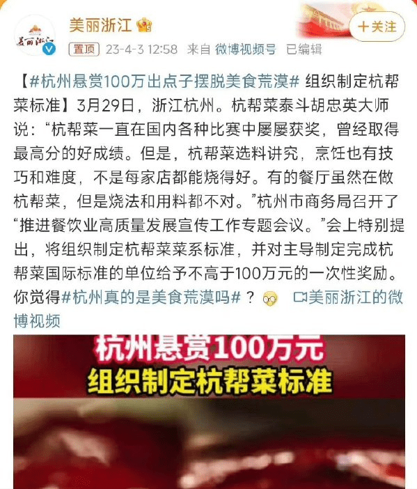 你對杭州的印象有哪些?是醉美婉約的西湖白堤?是繁華熱鬧的武林廣場?還是津津樂道的美食荒漠?最近,杭州百萬元鼓勵制定杭幫菜標準、讓大傢一起出點子擺脫杭州美食荒漠的名字引不適議。消息一出,不少網友紛紛吐槽杭幫菜雖然好吃,但是價格並不親民,拒做“美食荒漠”,要做具有杭州本地特色、價格實惠親民的傢常菜和大眾小吃。