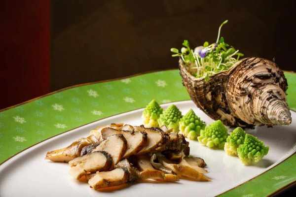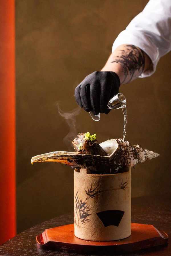 烹制炭燒響螺,必備的一份潮汕燒汁和一瓶高度白酒。潮汕燒汁用到火腿、肥膘肉、雞清湯、川椒、頭抽醬油等十幾味材料,一起熬成濃濃的湯汁。碩大的響螺整個上爐,用白酒和燒汁反復灌澆、燒煮、沖洗。幾小時後,螺肉烤熟,切成薄片,外表雪白無暇,嘗之有火腿的香、白酒的醇、豬肉的豐腴和雞湯的鮮美,它們都搭載在緊實微甜的螺肉上,這是中式烹飪的至高境界。