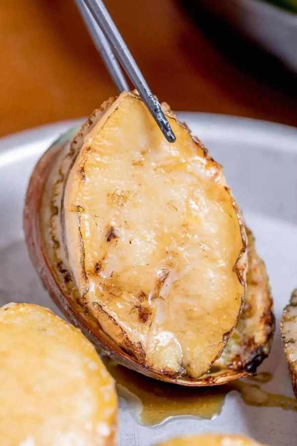 而潮汕人稱為“螺肝”的螺尾,更是炭燒響螺裡最精華的妙物。它肥美、滑嫩、充滿張力的煙火氣,類似法式鵝肝而過之。