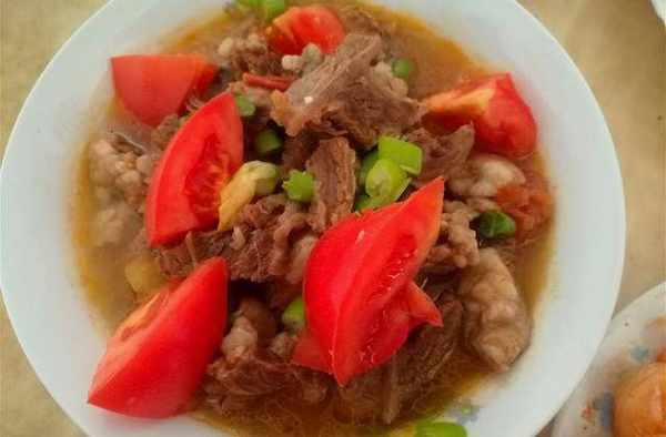 烤雞翅期間燒牛腩,鍋裡坐水,開始洗、切,焯燙牛肉,另一火燒熱倒油,放番茄炒出湯汁倒牛肉炒勻,炒勻後高壓鍋壓20分鐘。這道菜非常受歡迎,一盆吃光瞭,連湯汁都拌瞭米飯吃,酸酸甜甜的開胃又解膩。
