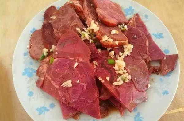 蒸著蝦的時間,把醬牛肉擺好裝盤。醬牛肉是超市買的現成的,切好的,拆開包裝就能吃,適合懶人。嘗瞭嘗感覺有點滋味不足,又澆瞭一勺醋蒜汁,醋蒜汁真是百搭的料汁,蘸什麼都好吃。