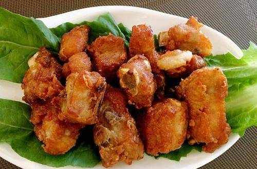 小公雞去頭、去爪子,改刀剁成小塊加醬油、食鹽、一點花椒粉、料酒、一個雞蛋、紅薯淀粉,抓拌均勻,最後再滴上適量的食用油。油溫五成,將雞塊下鍋,中小火慢炸,第一次炸就要炸熟;控油撈出後,升高油溫至七成,將雞塊二次下鍋復炸,將雞塊炸酥後控油撈出。趁熱撒上適量的花椒粉、辣椒粉、孜然粉等都可以。清炸排骨