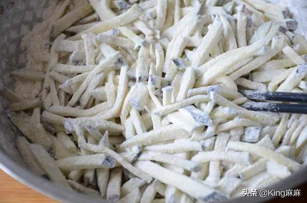 4,抓勻後再將面粉倒入茄條中,使面粉均勻地裹在茄條上。