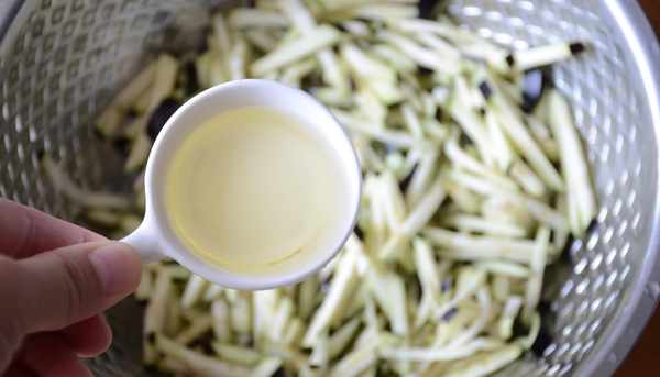 3,切好好後放入盆中,將植物油倒入切好的茄子裡,用手將茄條抓勻,放入植物油是為瞭鎖住茄條裡的水份。