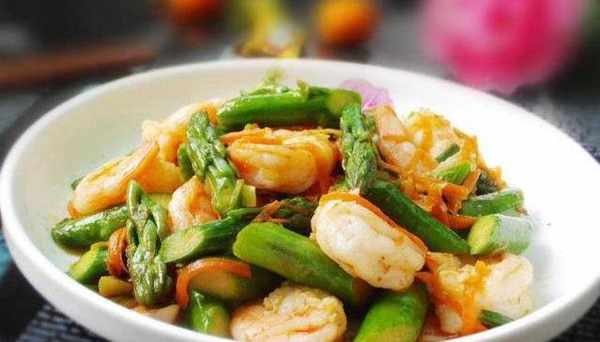 食材:蝦仁、蘆筍、胡蘿卜、蔥、薑、蒜、胡椒粉、料酒、油、鹽。