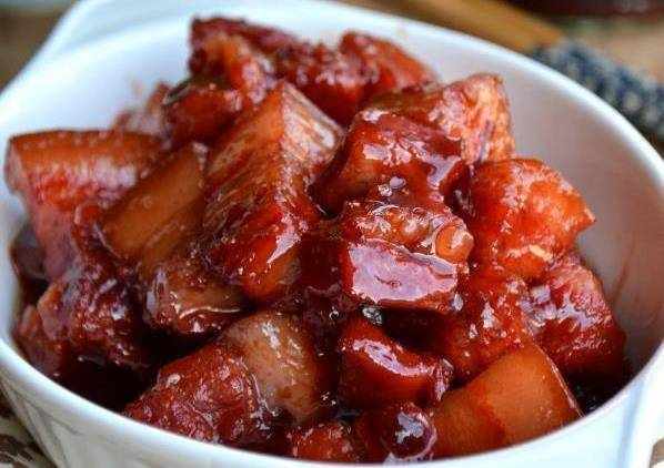 食材:五花肉、火腿腐乳、紅曲粉、冰糖、薑、蔥、生抽、料酒、油。