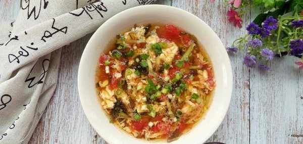 1.西紅柿去皮切成塊狀,紫菜適量用淡鹽水浸泡5分鐘,然後用清水淘洗兩遍,瀝去水分,小蔥1棵切成蔥花備用。
