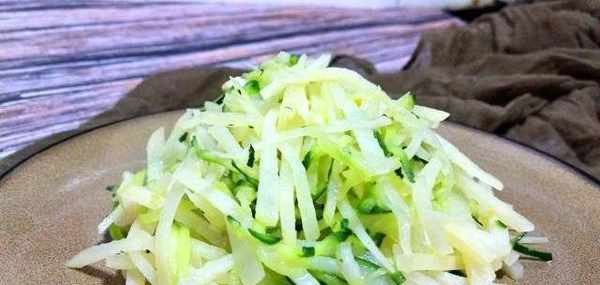 2.黃瓜洗幹凈,用刀切成細絲,也可以用刨絲器加工成絲,當然不能太細,否則一炒就沒瞭。