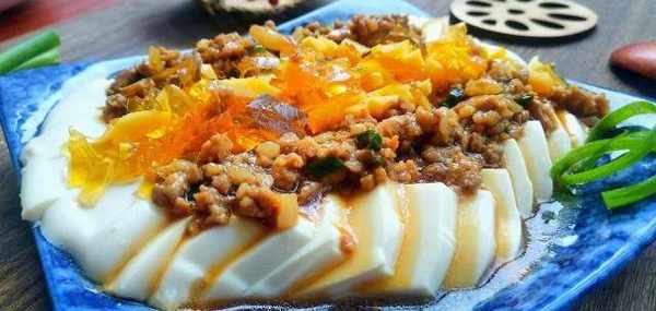 2.把嫩豆腐切成小塊,放入盤中,變蛋切成小丁,鋪在豆腐的表層。