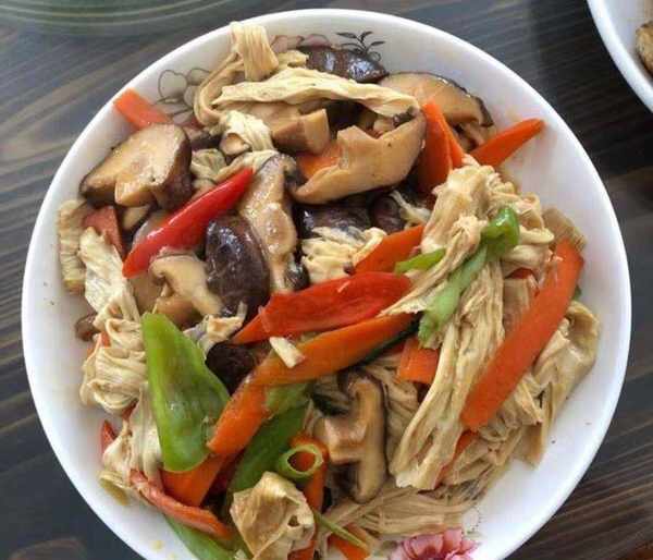6,香菇燒腐竹。材料:幹香菇,腐竹,胡蘿卜,鹽,老抽,蠔油,生粉,蒜苗。做法:腐竹、香菇提前泡至變軟,洗凈撈出改刀切成小塊,胡蘿卜去皮洗凈切成片,鍋裡倒油,放入胡蘿卜翻炒,然後倒入腐竹和香菇翻炒,加入適量老抽,蠔油攪拌均勻,加跟食材差不多齊平的水的水,悶煮幾分鐘,放蒜苗翻炒至蒜苗熟透,再放入生粉水勾芡即可出鍋開吃。