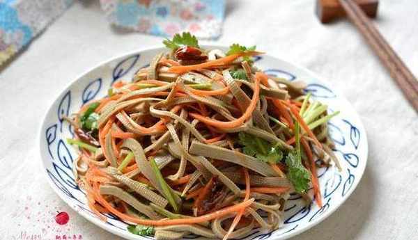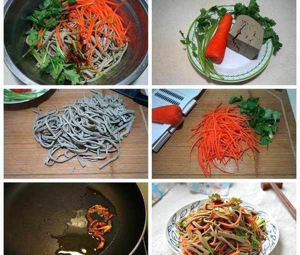材料:五香黑豆腐絲一塊,胡蘿卜半根,香菜2棵,油少許,幹紅辣椒3個,生抽少許