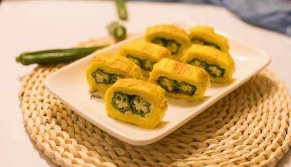 4、當蛋液還沒有凝固時,在上面放兩個秋葵,用鍋鏟子慢慢滾到鍋的另一邊;