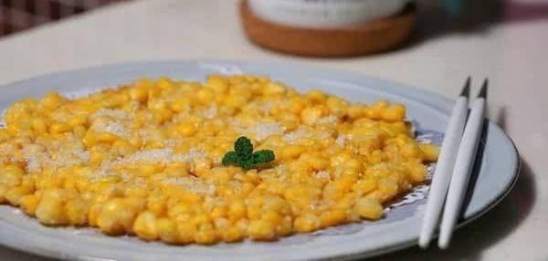 3、平底鍋刷油,玉米倒入鍋中壓緊,小火慢慢煎,翻面煎熟即可出鍋,出鍋切成小塊,撒點白糖就可以吃瞭。