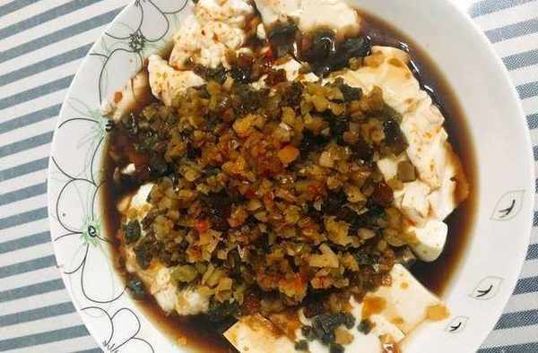 皮蛋豆腐:豆腐去掉盒裡析出的水,放盤子裡,用刀劃成小塊,皮蛋切成碎末,覆蓋著豆腐表面,在皮蛋表面撒一層薑粉,我用的味多美的生薑粉,榨菜切成碎末,撒在皮蛋表面,表面撒上一勺生抽,再撒上3勺醋,喜歡酸的可以再多加醋,撒上一小勺辣椒油,我偷懶,直接用的老幹媽的油,滴上幾滴香油,開吃!不要攪拌,用勺子從上挖到底吃,不然味道不均勻!