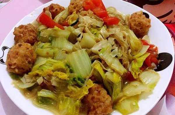 娃娃菜燉粉絲:將蔥,薑,大蒜,紅辣椒切好放一個盤子裡,娃娃菜洗幹凈切好,粉絲,丸子,豆皮都備好待用,將鍋燒熱後倒入適量油,把油燒熱,放入蔥薑蒜,放入娃娃菜,翻炒一會,放入適量鹽和醬油,加入少許水,放入粉絲,大火燒開,等粉絲熟瞭放入豆皮和素丸子,翻炒均勻,放點十三香,收汁出鍋。