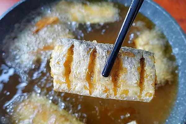 3:油溫燒至6成熱,下入帶魚,炸制兩面金黃,大約需要3-4分鐘左右,取出控油。