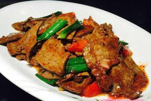 6、鍋裡放少許油將豬肝及調料湯汁一並下鍋翻炒幾下,加薄勾芡裝盤。