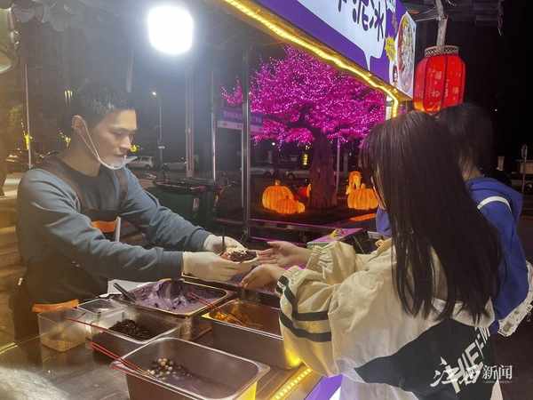 市集上,市民吃得過癮,攤主也忙中作樂。冰沙打底,覆蓋一層厚厚的芋泥,再撒上西瓜丁、芒果粒、紅豆等小料……兩三分鐘時間,一碗香甜可口的芋泥冰沙就做好瞭。“今晚生意不錯,已經做瞭50多份,材料快不夠瞭。”攤主王雲峰邊說邊忙碌著。24歲的他是一名退伍軍人,去年退役後一直沒找到心儀的工作,便萌生瞭自己創業的想法。“碰巧在抖音上看到幸福市集在招商,就想從小本生意開始試試。”他笑著說,“這個芋泥冰沙年輕人都愛吃,每晚都有大學生來買,一晚賺三四百不成問題。”