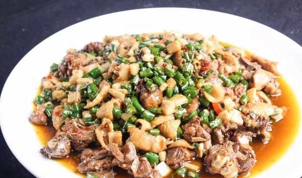 3、鍋中倒入仔公雞肉丁(切成1.5厘米)翻炒,然後再倒入肥腸即可,最後加入味精調味,少許花椒油增香後起鍋。