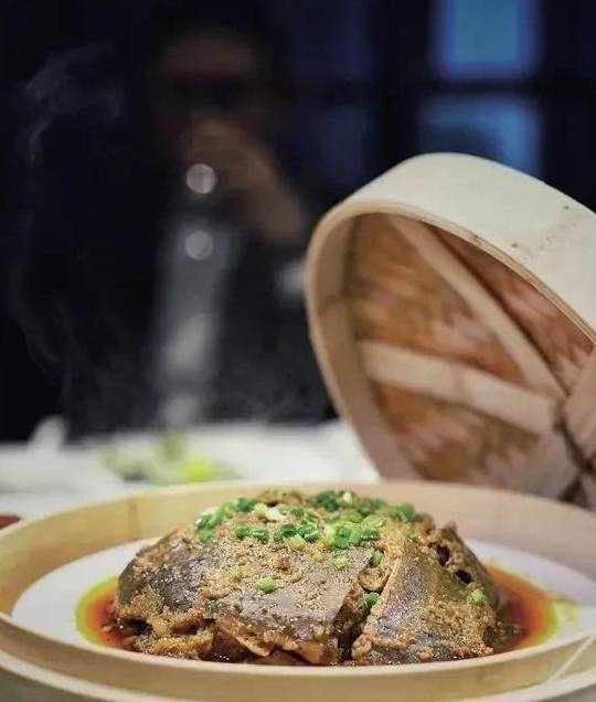 4.將甲魚殼挑出來依次在選好的扣碗中擺放好。然後把拌好的甲魚塊均勻地放入扣碗中,中間留下一個窩。最後將青豌豆和肥腸放入碼碗,與剩下的蒸肉米粉拌勻,放入窩中。將其放入蒸箱蒸2小時至肥腸甲魚糯,取出來倒扣在盤中,撒上蔥花即成。