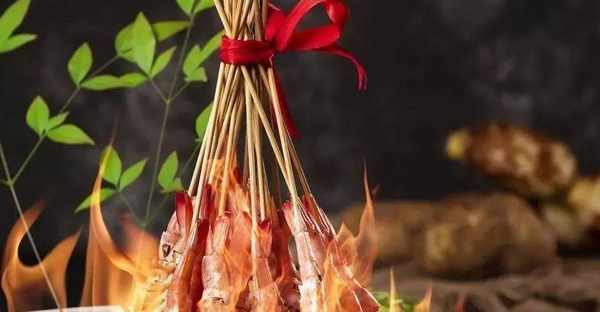 這道菜在幹鍋香辣蝦的基礎上升級而來。基圍蝦用竹簽穿好,方便取食,成菜用鋁箔紙包好,上桌後再加少量白酒點火加熱,增強瞭菜品的視覺形式感。