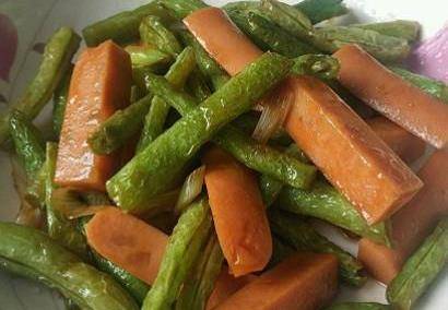 豆角炒火腿:豆角擇幹凈。切成段,放在鹽水裡浸泡10分鐘。浸泡豆角的空檔,火腿切成丁。炒鍋倒適量的食用油。放入火腿。翻炒至肥肉部分變成透明。倒入兩勺生抽,翻炒均勻。倒入豆角。翻炒豆角和火腿。炒至豆角變色。倒入一勺雞精。出鍋即可。