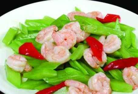 萵筍炒蝦仁:基圍蝦去頭去尾去蝦線,剝出蝦仁,用料酒、鹽、生粉醃片刻。熱鍋,下蝦仁滑炒,起鍋。鍋中留底油,下蒜薑爆香,然後放入萵筍翻炒一下。接著下青紅椒炒勻,等鍋中的萵筍丁變成深綠色,放入鹽、味精調味關火。最後放入蝦仁利用鍋內餘溫拌勻即可。