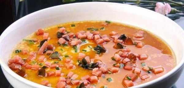 雞蛋5隻,火腿50克,皮蛋1隻,蔥花10克。
