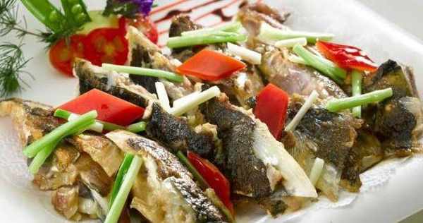 2.熱鍋冷油後,把處理好的魚塊放入,小火煎制兩面金黃時,放入蒜薑片和青紅椒片爆香。放入調味料,加入適量的水,燜制入味時,撒入蔥段,大火收汁即可。