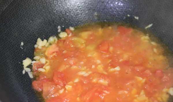 11、接著,將事先切好的蕃茄放入鍋中,翻炒至軟爛,炒出蕃茄的湯汁。