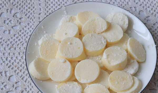3、然後,將切好的玉子豆腐兩面都裹上澱粉,不需要很多,薄薄一層即可,如圖。這裡用到的玉米澱粉,是食譜中額外的用量。