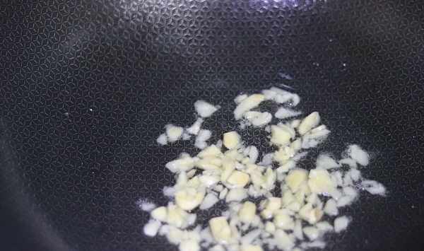 10、然後,在炒鍋內留有少許底油,油熱後放入蒜末,用鍋鏟翻炒出香味。