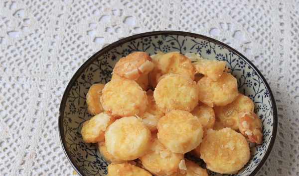 5、如圖所示,這是炸好的玉子豆腐,兩面金黃且外皮酥脆,給它們撈出控油,放在盤中備用。