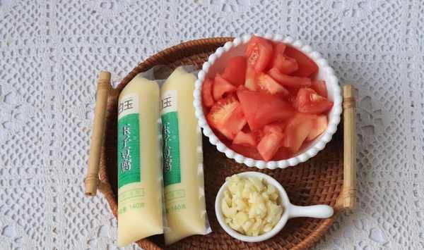 【食材】:玉子豆腐2條、蕃茄2個、蒜末10克、生抽2勺、蚝油1茶匙、番茄醬1大勺、白糖1小勺、玉米澱粉1勺、清水半碗、香葱末少許、食用油適量。
