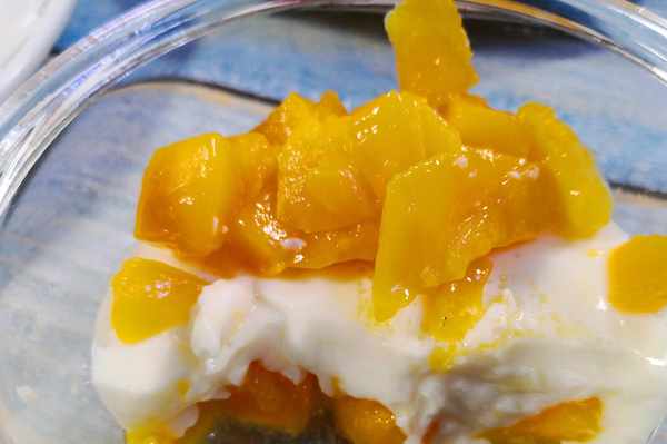 5、加入切好的芒果塊,加入椰漿、蜂蜜等調味。