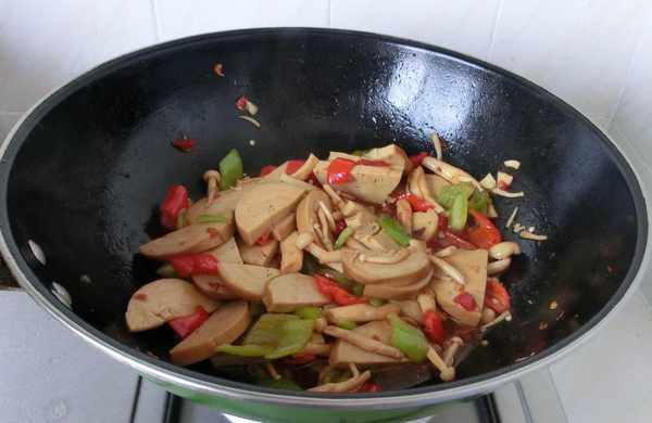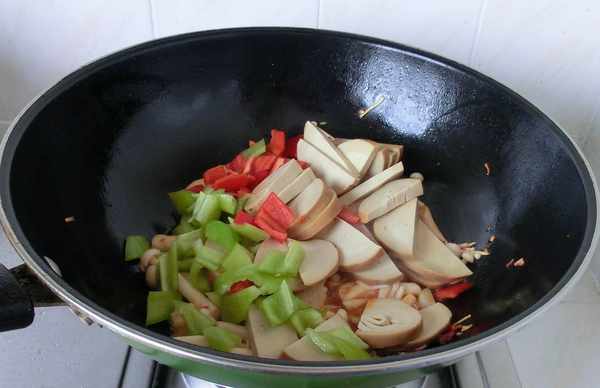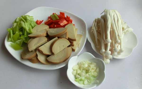 材料:素雞300克,青椒1個,紅椒1個,海鮮菇150克。