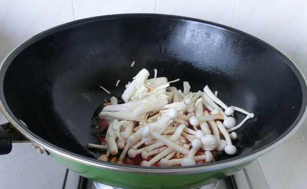 3. 鍋中留底油,下 蔥、蒜、薑末炒香,放入海鮮菇炒軟。