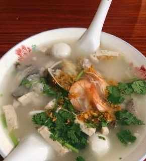 鹵面就是堿面在清水中煮熟之後,倒進碗裏,而後再加上各種鹵料和海鮮,像是鹵豬腸、鹵豆干、鹵臘腸、魷魚、大蝦等等,然後再淋上一勺鹵汁,撒上一點花生碎末和蔥花,就可以食用了。鹵面的鹵香味濃,麵條富有彈性很是爽口,而各種鹵料和海鮮也是各有風味,吃了是讓人大感滿足。