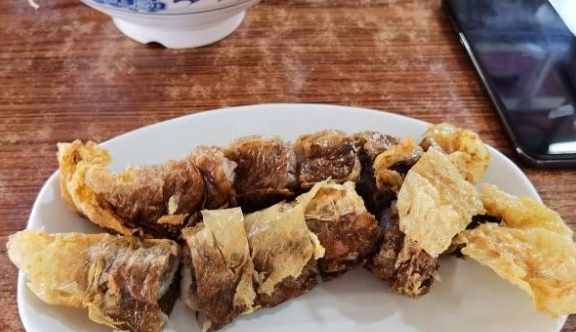 五香卷的成品表面金黃酥脆,而裡面則脆嫩爽口,香、甜、鹹、鮮皆有,如果覺得太幹,還可以蘸醬,番茄醬或辣椒醬都可以,吃了也是別有風味。