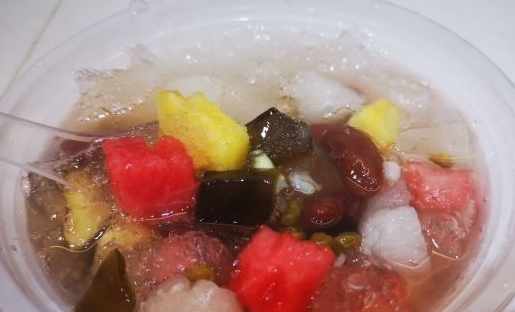 四果湯是漳州非常有名的一道甜點,雖然名叫四果湯,但它的配料其實還是蠻多的,有薏米,綠豆,紅豆,蓮子,白木耳,還有各種水果,如鳳梨,西瓜等,有的還有蜜餞,仙草,芋圓,布丁,圓子,阿達子等等,食材相對豐富,而且顏色非常鮮豔且多彩,單單看起來就特別吸引人了,吃起來也是香甜美味,冰涼爽口,有清熱降暑的功效。