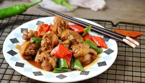 6、時間到以後掀蓋,轉大火收汁,待湯汁快收幹的時候,將提前準好的青紅辣椒倒入,大火快炒至辣椒斷生即可出鍋。