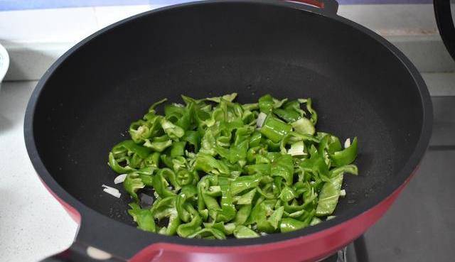 青椒切成小方塊,炒鍋燒熱油爆香蒜,放入青椒煸炒,青椒炒出香味。
