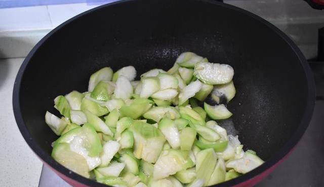 絲瓜削皮切滾刀塊,不粘炒鍋燒熱油,爆香薑片,放入絲瓜煸炒,將絲瓜炒至斷生。