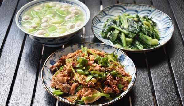 這些就是我們兩個人的午餐,分別有青椒炒雞、蒜蓉炒油麥菜和絲瓜肉丸子湯,青椒炒雞和蒜蓉炒油麥菜都是傢常菜,制作非常簡單,這兩道菜15分鐘之內就能做好。這個夏天,我丈夫特別喜歡絲瓜煮湯,絲瓜汁水多清甜。以前我煮絲瓜湯,絲瓜煮得黑乎乎的,湯水味道挺好就是很不好看。我想瞭一些辦法,現在用絲瓜煮湯,絲瓜還能保留碧綠的色澤,我自己比較滿意這樣的絲瓜湯。下面就來分享一下這桌午餐的詳細做法,特別想分享絲瓜湯的做法。