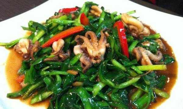 韭菜魷魚須-1.韭菜切段,魷魚須切條。2.鍋內上熱水把魷魚須放進去燙一下撈出過冷水,最後瀝幹待用。3.鍋內放油,下魷魚須大火翻炒,加醬油,精鹽,少量味精,料酒,十三香粉煸炒。4.最後放入韭菜大火翻炒即可。1.韭菜切段,魷魚須切條。