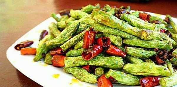 幹煸豆角-1、扁豆兩頭撕去老筋,掰成兩節,洗凈,控幹。2、燒熱250克油,放入扁豆,炸到扁豆表皮起皺時,用笊籬撈出控凈油。3、另取鍋燒熱,用1大勺油爆香肉末、幹辣椒、花椒、榨菜、蒜粒。4、倒入老抽、扁豆翻炒,扁豆熟透時關火,放鹽和味精,炒勻即可。