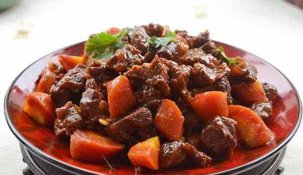 2、鍋內倒入油,燒至七成熱,將牛肉塊放進去翻炒。加生抽、幹辣椒、薑片、老抽、料酒、洋蔥片、少許糖,將牛肉片翻炒變色。再倒入沒過牛肉塊的熱水,大火煮開,小火燜煮30-40分鐘,直到牛肉軟爛。