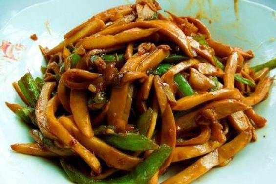 青椒素炒杏鮑菇:1、將青椒切成細條狀或薄片。2、把杏鮑菇洗凈,切細條狀切條狀較好入味。3、將大蒜瓣輕拍去皮,切丁4、在熱鍋中加入一些食用油5、待油熱時,加入切好的大蒜爆香。6、大蒜炒出香味後加入切好的青椒絲翻炒,加入少許食鹽,讓青椒入味,脫水。7、待青椒稍微斷生時加入杏鮑菇,大火翻炒。再加入鹽,生抽調味。少許老抽調色。8、待青椒和杏鮑菇都斷生之後加入少許雞精拌炒均勻即可。